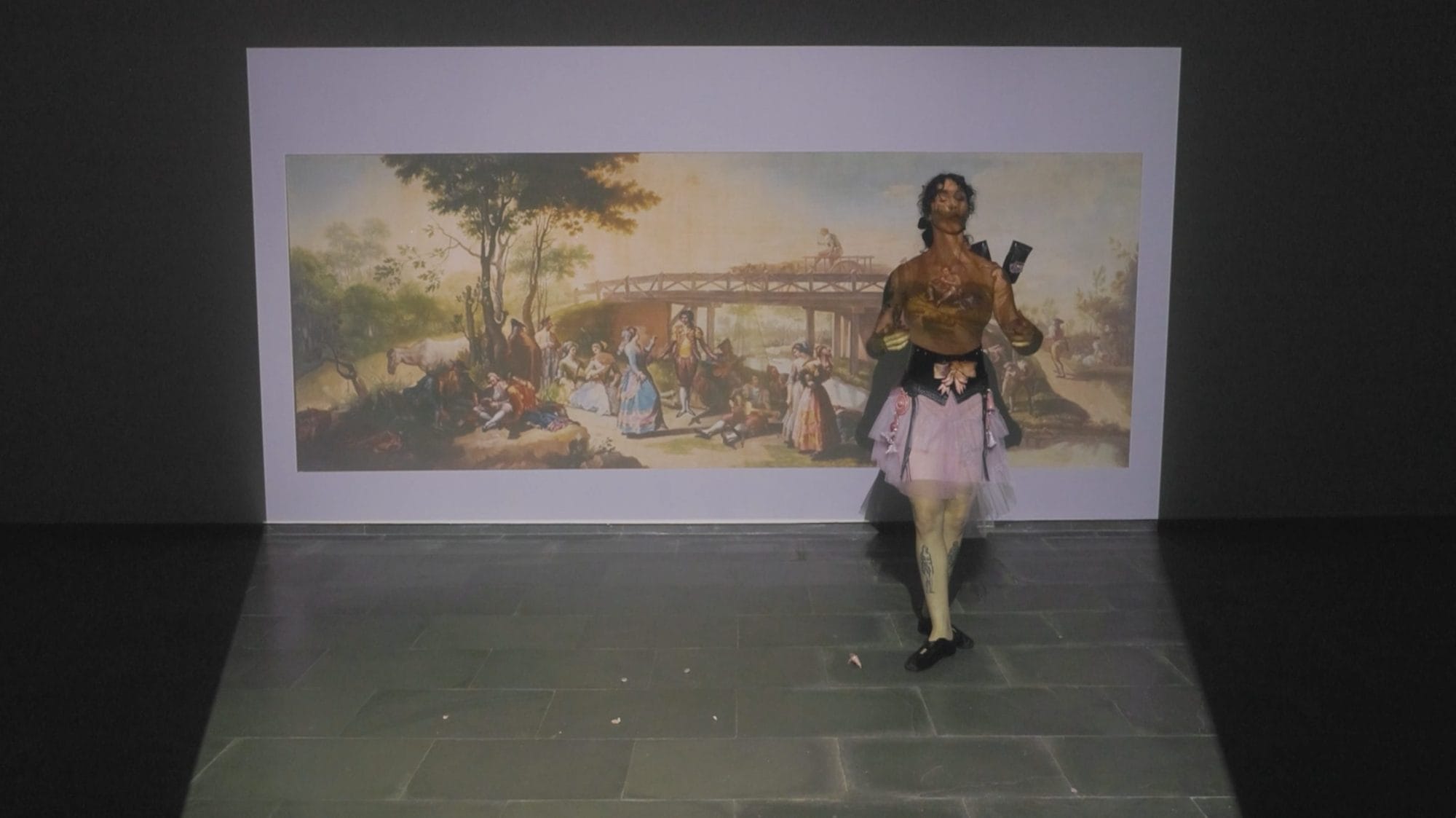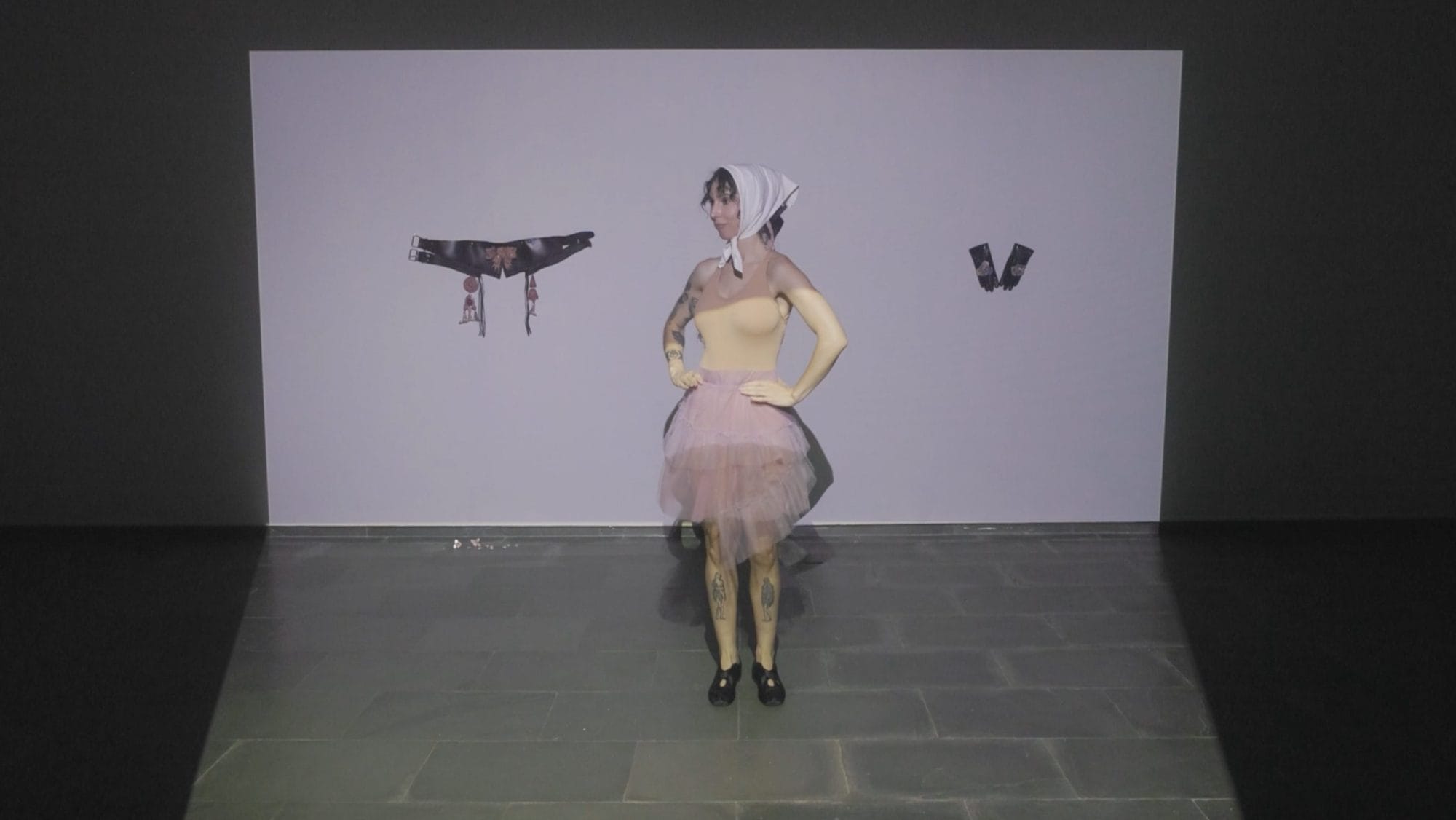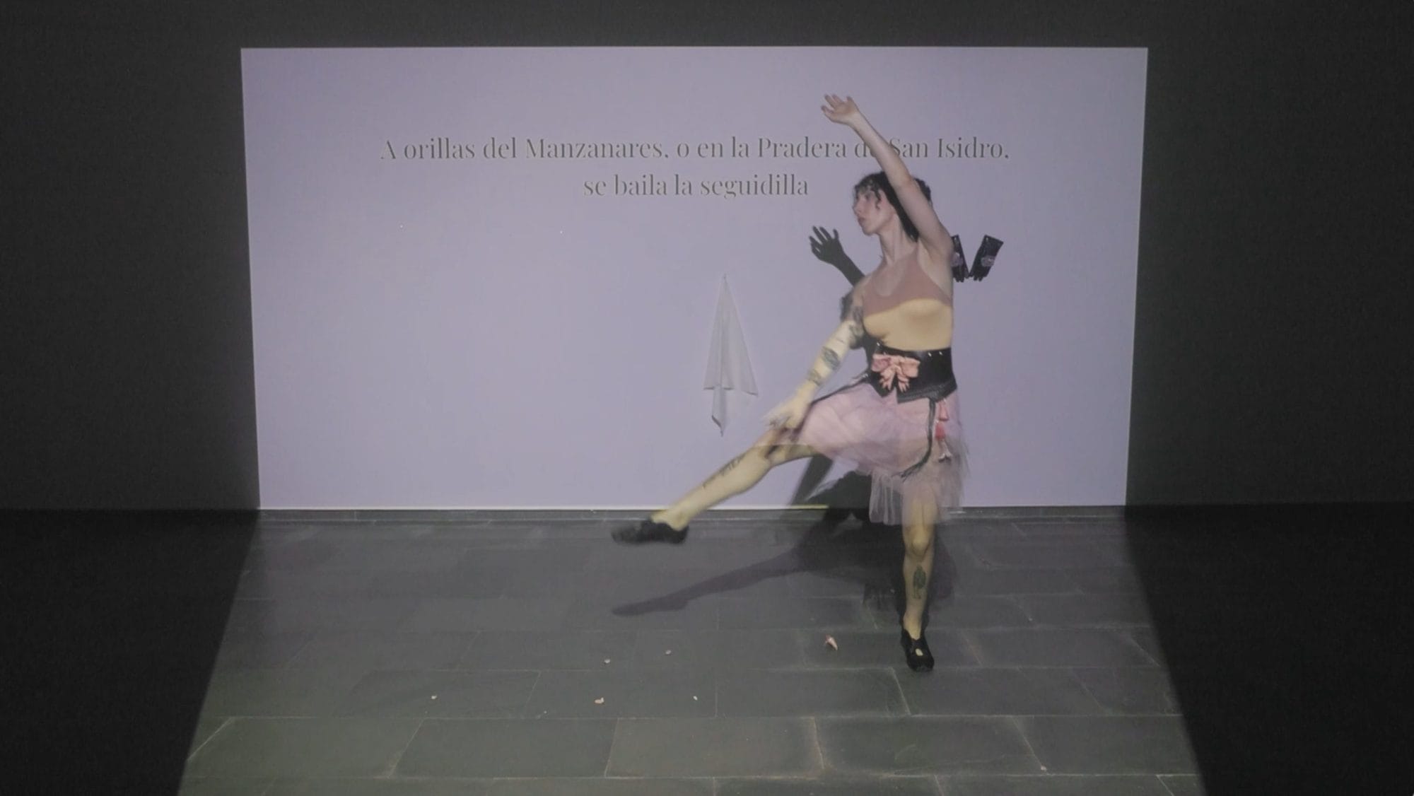 Junto con el vídeo, la narrativa se articula pa través de tres piezas, a medio camino entre lo escultórico y la indumentaria, que son activadas en distintos momentos: una faja de cuero y cerámica inspirada en los cinturones que llevan las mujeres representadas en las estampas de Téllez, un pañuelo blanco como el del atuendo de chulapa y unos guantes de cuero con piezas cerámicas creadas a partir de reflexiones del barrio en la actualidad. A lo largo de la performance se intercalan imágenes de vídeo y texto proyectado, con sonido y acción dancística en vivo.