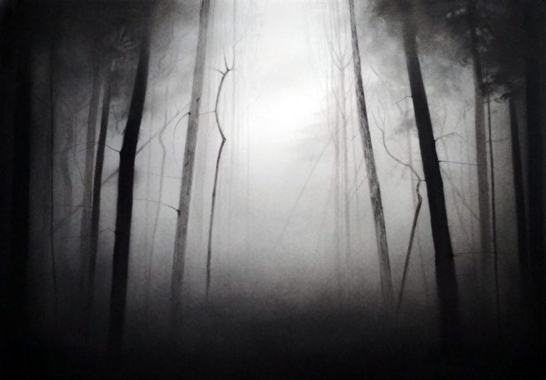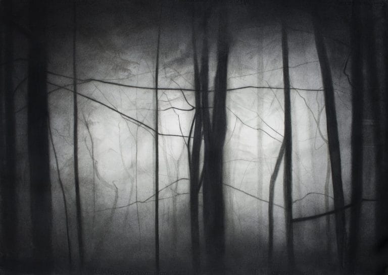 Los viajeros románticos eligen otro viaje. Es un viaje hacia la Naturaleza que se abre como horizonte infinito a la mirada de los nuevos viajeros. Parten de una nueva Naturphilosophie que los filósofos de Tübingen y Jena piensan en la transición del siglo. Es el contexto en el que Novalis, Kleist y el mismo Hölderlin, piensan. Frente a la armonía y equilibrio clásicos que Winckelmann defendiera en sus Gedanken, aparece ahora un mundo de sombras que recorren por igual el mundo natural como el de los sentimientos, ese mundo interior que las artes interpretan, música y poesía, literatura y pintura. Y lo que al principio parecía ser una fuga del orden clásico, se impone como el momento en el que nace una nueva modernidad. Cuando Caspar David Friedrich en 1818 pinta Der Wanderer über dem Nebelmeer, ‘El paseante sobre el mar de nubes’, ya expresa esa nueva Sehnsucht que orienta no sólo el sentimiento sino la mirada de un arte que construye su visión que repiensa el lugar del hombre en el mundo. Atenta siempre a esa época y orientando su trabajo en diálogo con momentos principales de la tradición romántica, M. Ángeles Díaz Barbado, se cita ahora con una de las obras más sublimes de ese tiempo, como es el Winterreise de Franz Schubert, ciclo de Lieder sobre poemas de Wilhelm Müller. Sin duda se encuentra ante un momento decisivo. Schubert los escribe en los meses anteriores a su muerte, ocurrida en Wien en 1828 con sólo treinta y un años. La emoción, perplejidad de quienes escucharon por primera vez estos Lieder anunciaba la perfección absoluta de quien en su breve vida había sido el autor de composiciones memorables. Ahora, ante las puertas de su final su música desafiaba el tiempo citando al silencio a formar parte de esa música. El recuerdo del Adagio del Streichquintett, su tiempo lento premoniza ya esta música final. Se trata de un silencio que se identifica con el silencio de la Naturaleza, interpretándolo. Es así como partiendo del cuarto Lied, Erstarrung, ‘Congelamiento’, se componen estas silenciosas Variaciones sobre un tema único, los helechos del bosque. Aquí todo coincide, el bosque como metáfora privilegiada del mundo natural, el silencio que recorre el espacio de la noche y la sombra, el aparecer misterioso de los helechos plateados que tapizan la tierra, ellos los guardianes silenciosos de la Erde, de la tierra, como escribiera Kleist. Y todo compuesto desde otro silencio, el de la escritura. M. Ángeles Díaz Barbado vuelve a darnos una lección de su poética radical. Sobre el papel negro el dibujo suspendido en blancos y platas que acentúan el tono del invierno. Ella, tan próxima siempre a Thomas Bernhard, comparte con él el sentimiento de su Frost, ‘Helada’, aquel tiempo que abraza el mundo en su silencio y espera. Una forma de amor a la Tierra protegida ahora por los helechos guardianes.