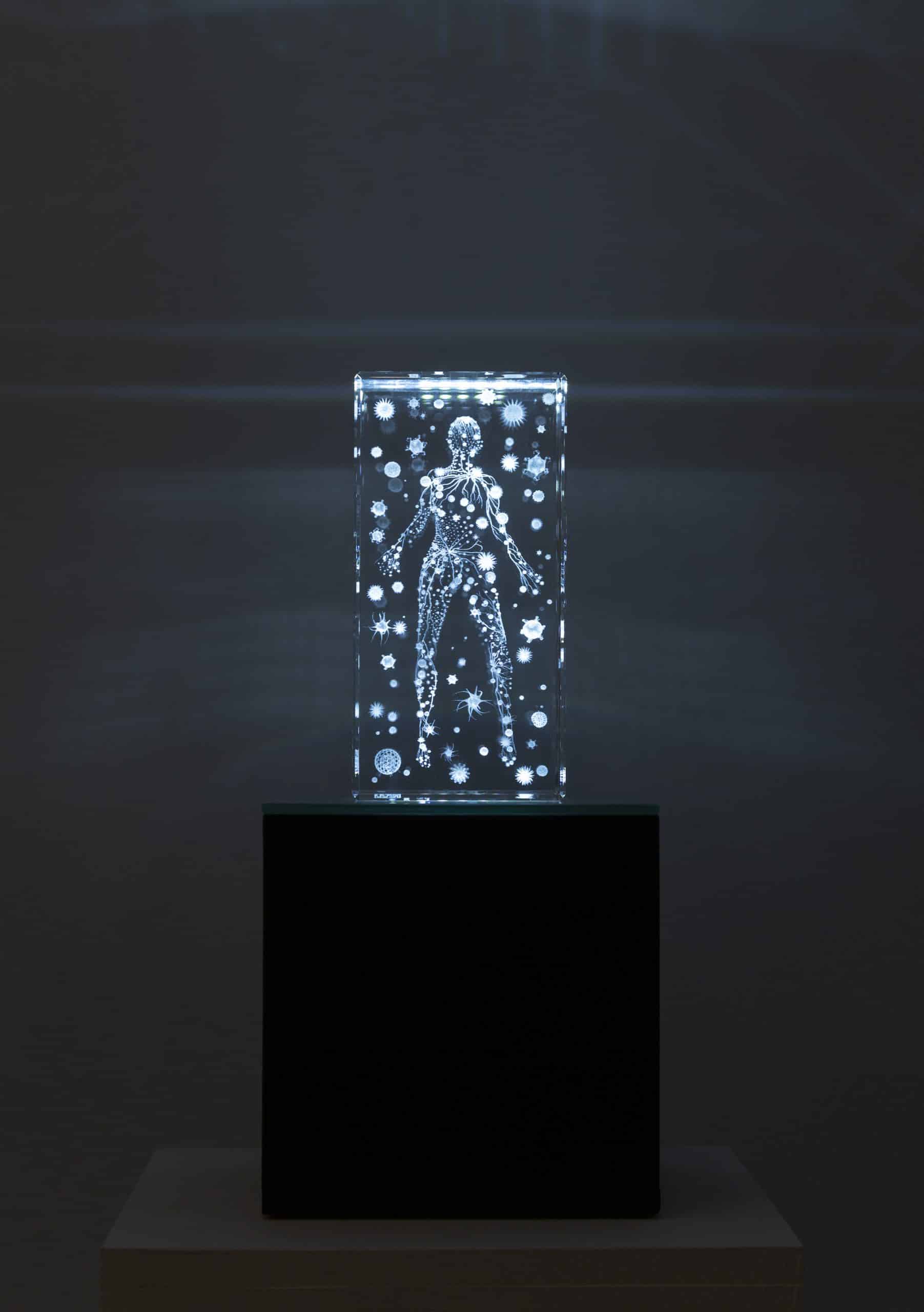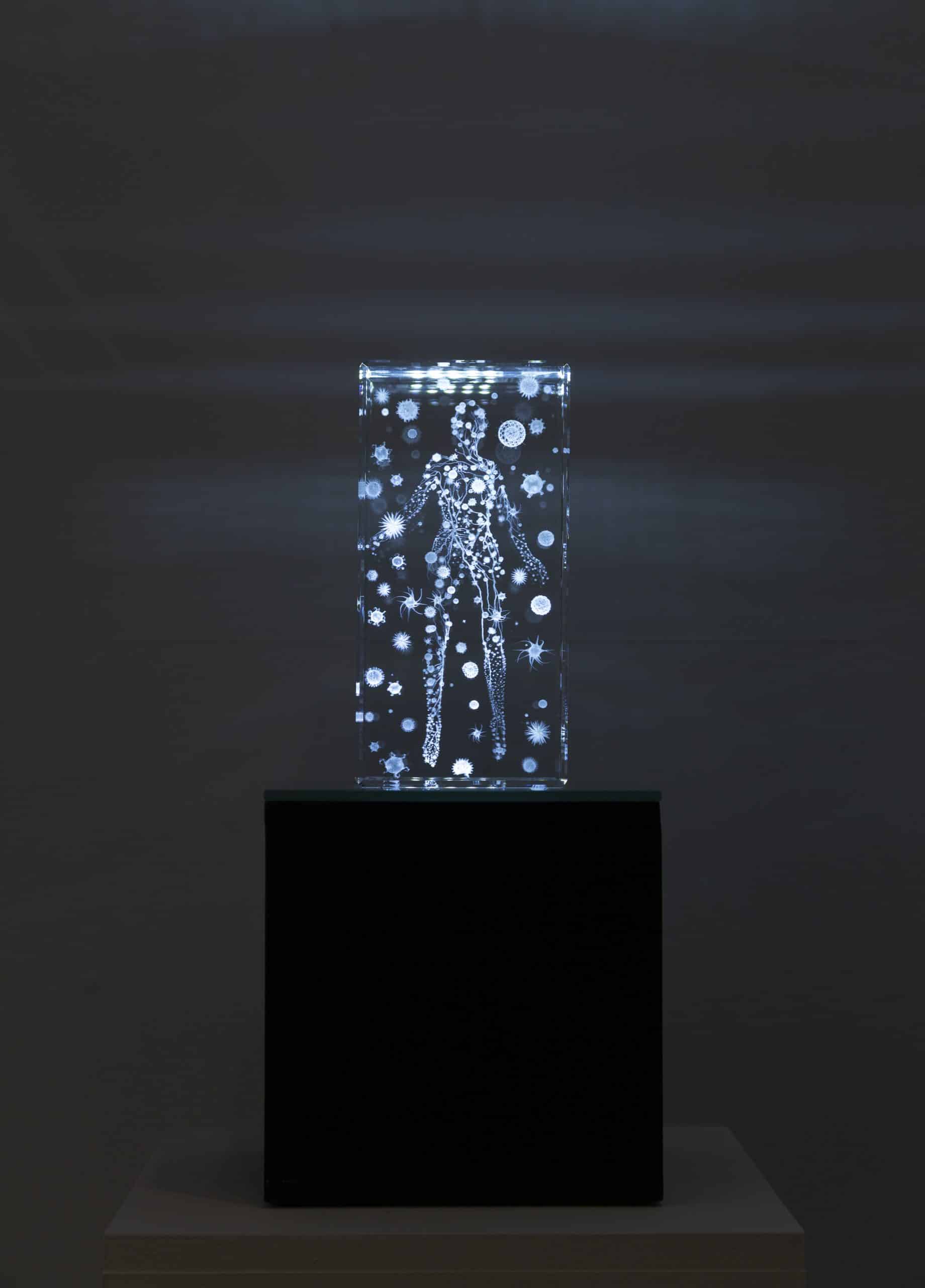 In Historia natural biology spreads and flows through technology. Using digital tools such as laser engraving on glass Marina reflects on the limit between nature and identity. Taking a rectangular prism as a base, she uses laser to engrave a silhouette that in its turn is composed of a series of microscopic particles.