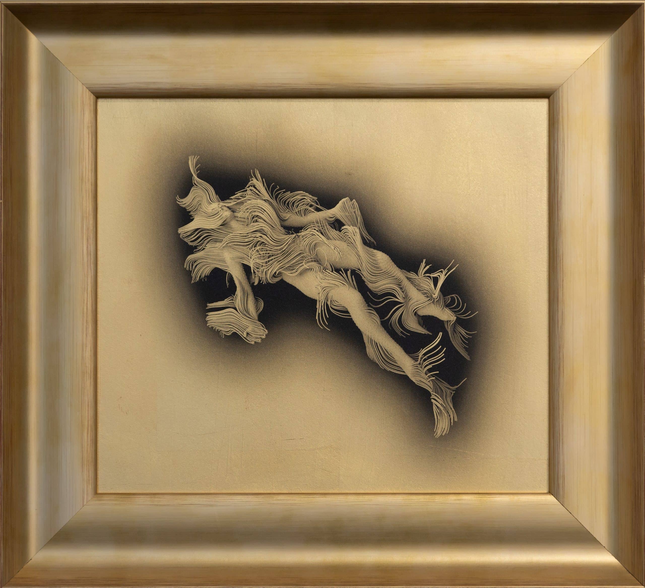 In the series Marejada this fragility becomes strength in a combination using digital imaging and gold leaf. A human silhouette strung in a sea of filaments and textures fills the centre of the image. Far from limiting its movement, the centre figure retrieves the impulse present in the Historia natural series. Faced with the immobility of the setting the action of the subject breaches the limits imposed. The action becomes gesture and the body becomes the subject.