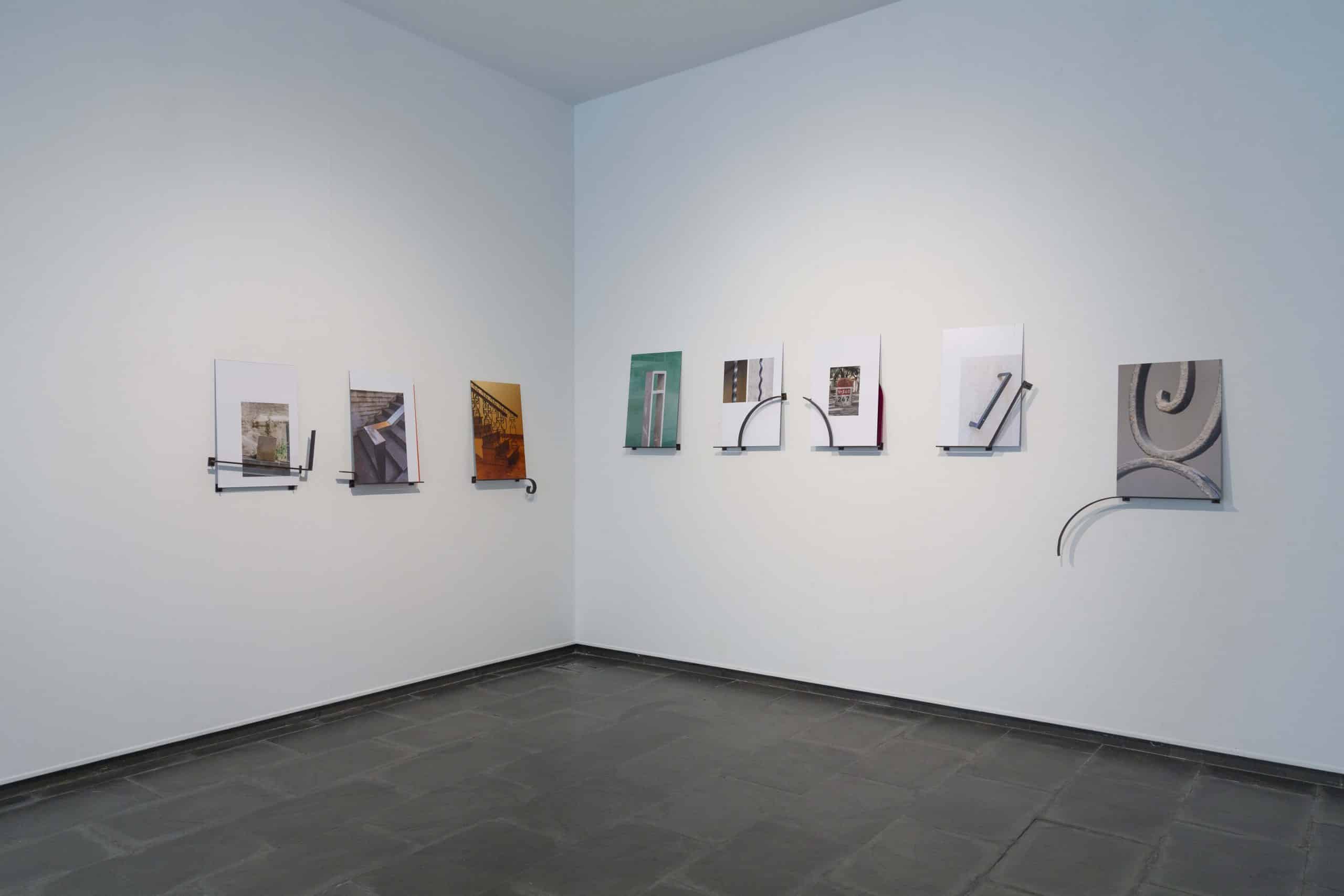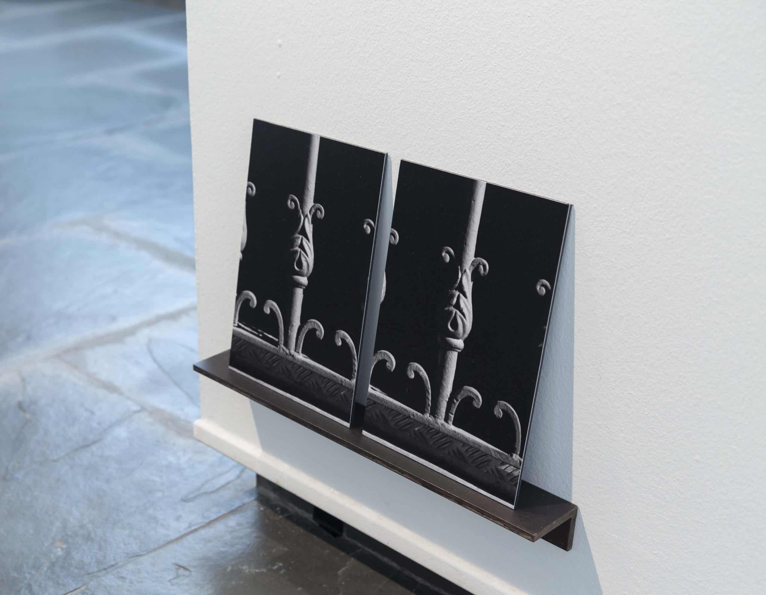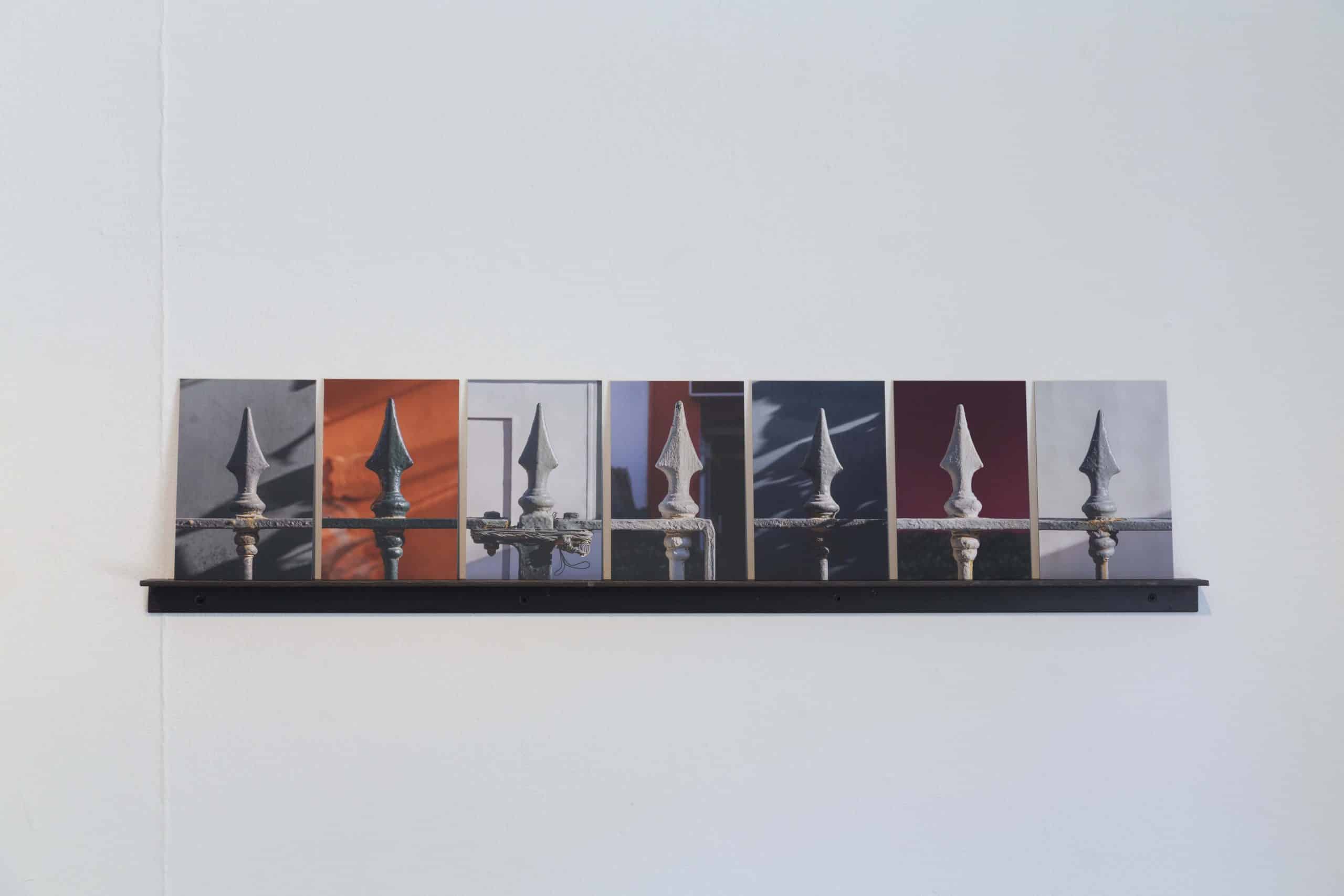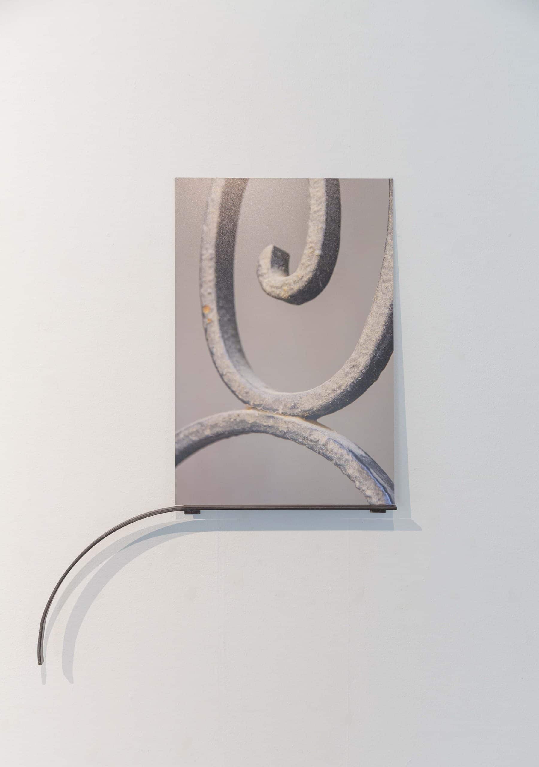 Antonio R. Montesinos presents a photographic selection of architectonic details, urban equipment or objects typical of the urban space in which he has developed the project, superimposing other elements such as modelled metalic supports. Once again we observe the wrought-iron work seen in Cardoso’s work. This time, however they are inserted in the photographs to show us some of their details and blocked by these metal pieces whose hardness are a far cry from the fragile material used by Natalia. Two further series composed of various smaller photographs are hung in the room, forming a horizontal line that, picking up the same theme, conform a rhythmic composition.