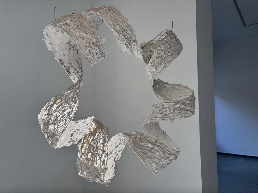 Es en su intencionada fragilidad —en esa sensación de estar abiertas o inacabadas— donde la obra adquiere una dimensión participativa. Así, en piezas como Caleidoscopios (Columpio) – con su conjunción de tres maceteros unidos entre si de forma piramidal, en cuyos agujeros se insertan los mencionados caleidoscopios. O Toroide (Flotante) – una construcción helicoidal tejida con fibra natural alrededor de un flotador retirado posteriormente – continente y contenido dialogan desde sus áreas inconclusas o ausentes, exponiendo el mecanismo detrás de la forma. En otros casos, como sucede con El Andrógino u Hoguera, es, precisamente, la forma cerrada y rotunda la que es puesta en cuestión mediante estrategias de simulación, trampantojo o hibridación.